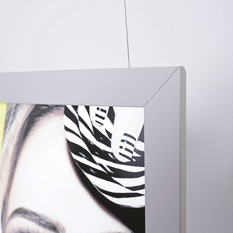 Cienki profil ramy zapewnia nowoczesny wygląd oraz równomierne rozproszenie światła na całej powierzchni grafiki, podobnie jak w ekranach telewizorów LCD. Dzięki temu wydruki są czytelne, jasne i atrakcyjne wizualnie, niezależnie od warunków oświetleniowych.