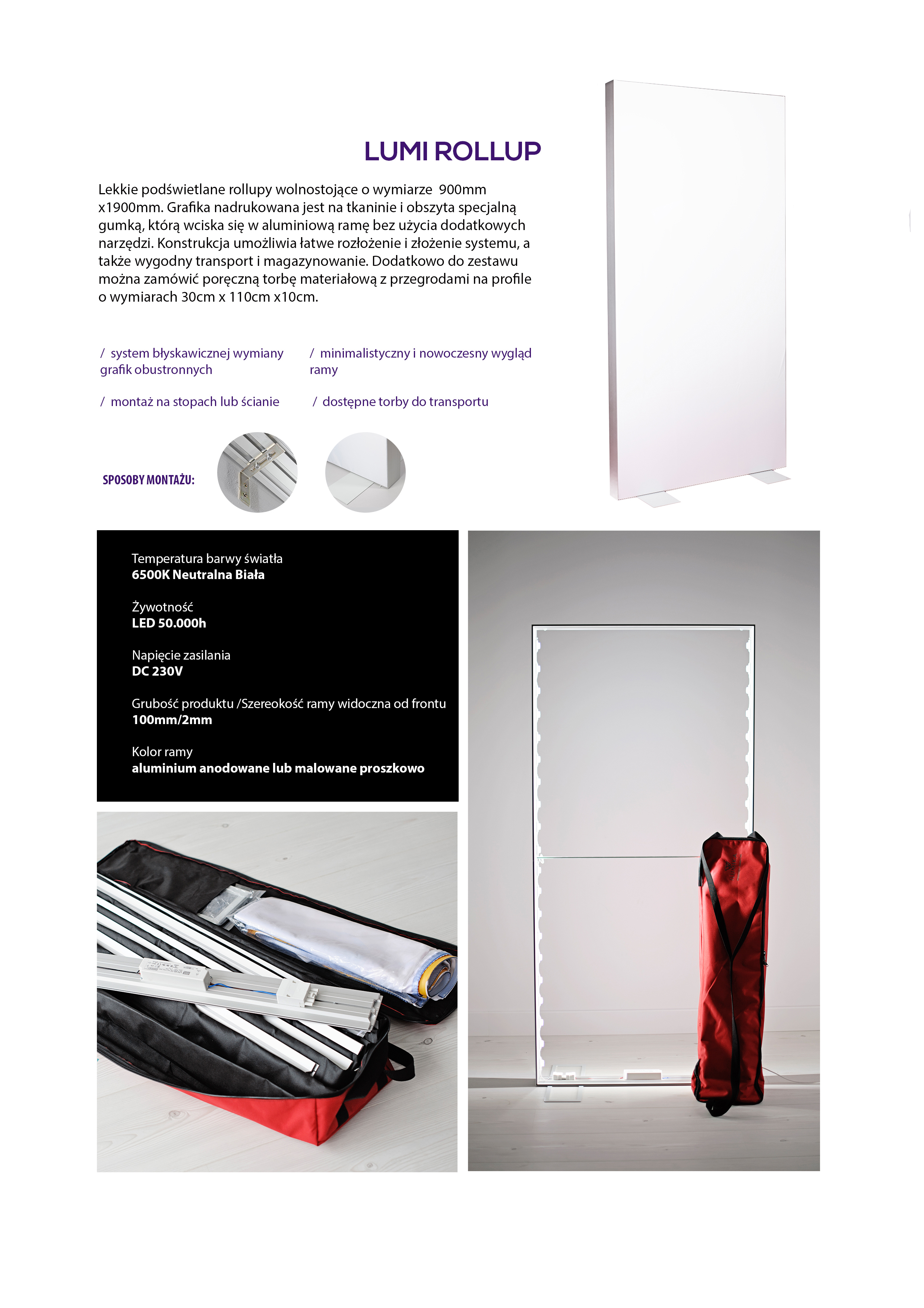 Lekkie podświetlane rollupy wolno stojące o wymiarze 90x190 cm. Idealny wybór dla firm poszukujących mobilnego, estetycznego i efektownego systemu reklamowego.