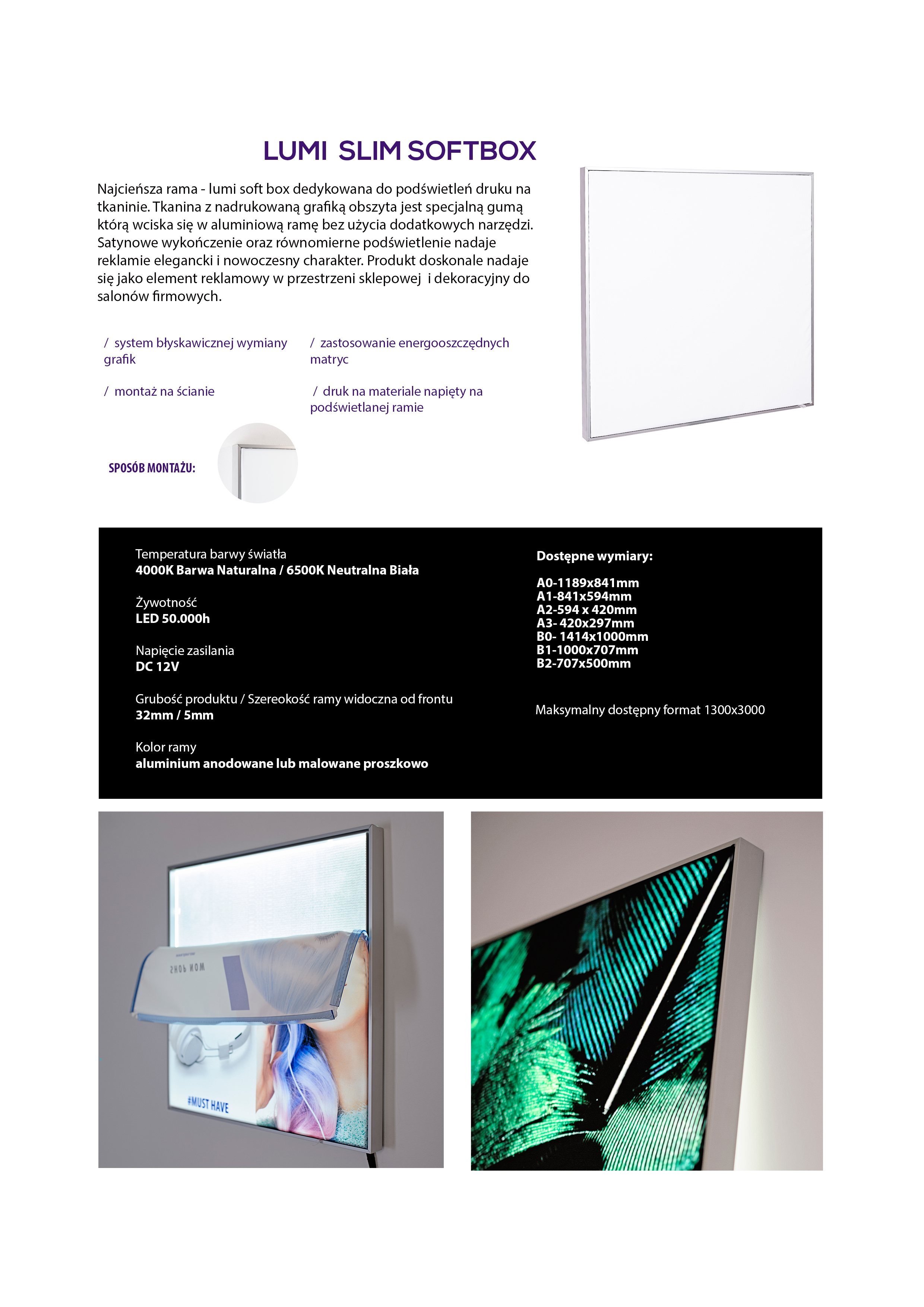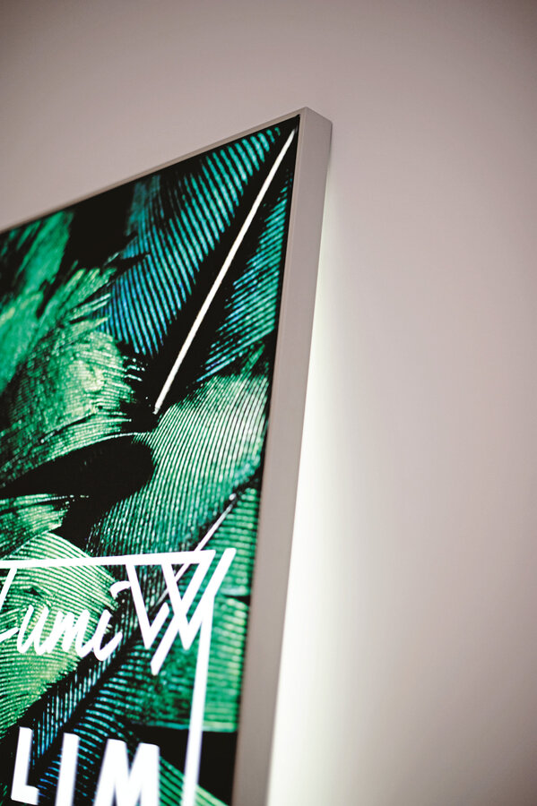 Dzięki wbudowanemu podświetleniu matrycą LED grafika jest równomiernie rozświetlona i przyciąga uwagę, podnosząc estetykę prezentowanej przestrzeni. Smukła konstrukcja sprawia, że rama doskonale sprawdza się w przestrzeniach sklepowych, jako element dekoracji salonów firmowych, a także jako część zabudowy meblowej.