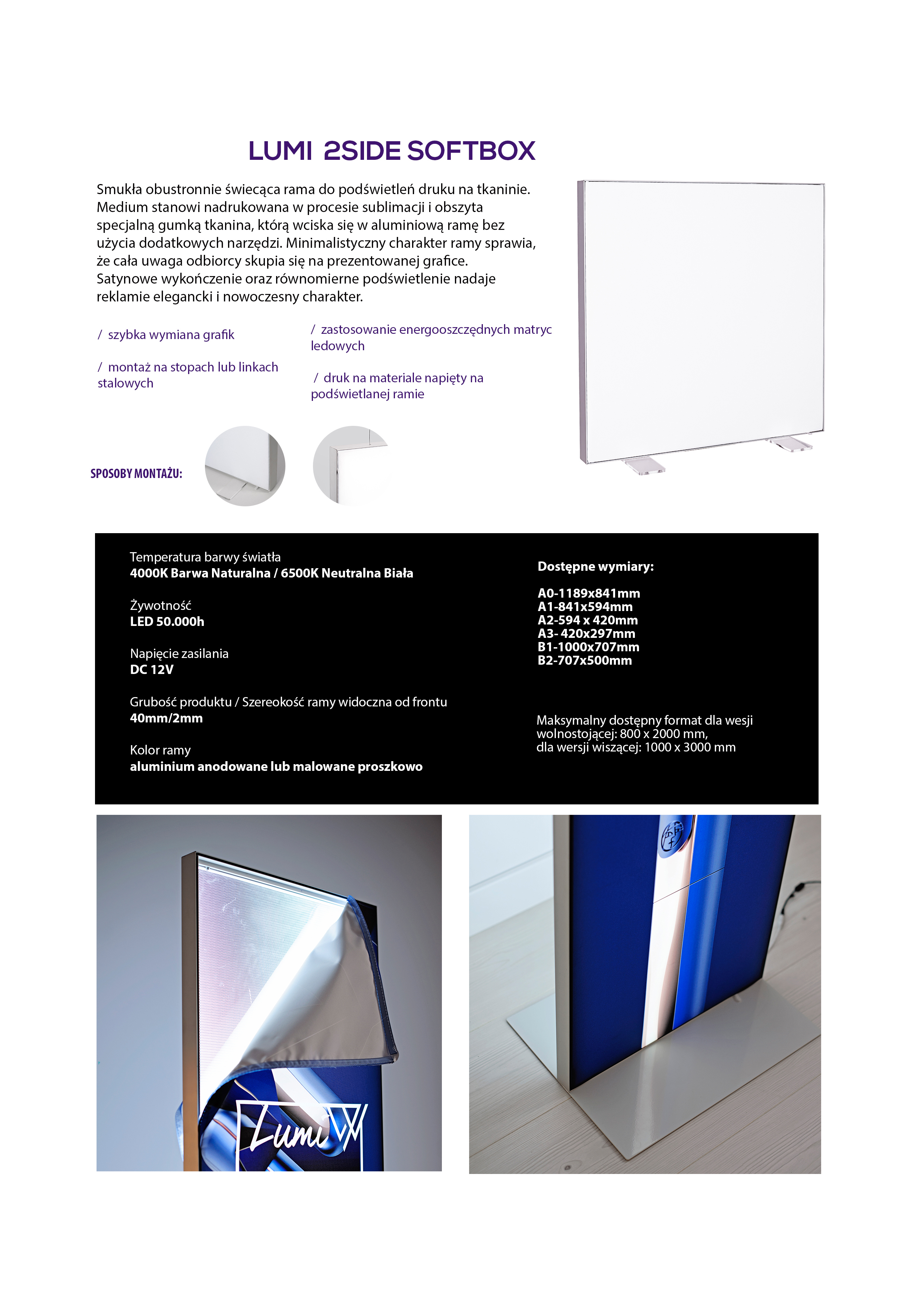 Smukła obustronnie świecąca rama do podświetleń druku na tkaninie. Minimalistyczny charakter ramy sprawia, ze cała uwaga odbiorcy skupia się na prezentowanej grafice.